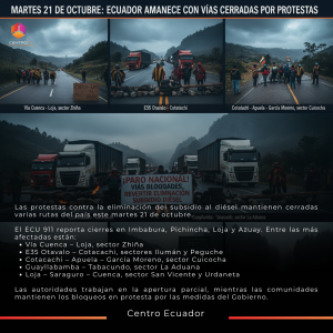 Ecuador amaneció este martes 21 de octubre de 2025 con múltiples vías cerradas a causa de las protestas convocadas por organizaciones sociales e indígenas.