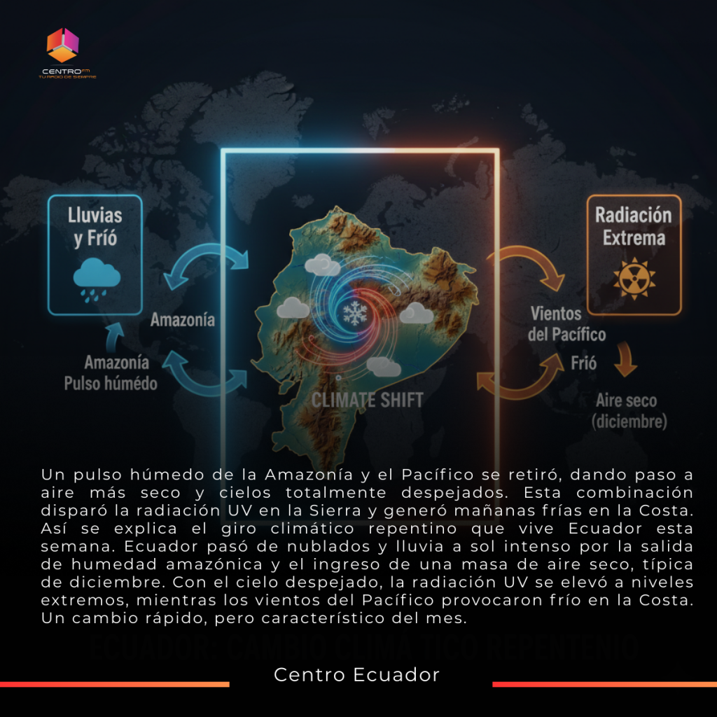 Durante la primera semana de diciembre, gran parte de Ecuador registró lluvias frecuentes, nubosidad densa y humedad elevada. Sin embargo, en cuestión de horas, el país experimentó un giro abrupto hacia condiciones totalmente distintas: madrugadas frías en la Costa, radiación UV extrema en la Sierra y un ambiente más seco de lo habitual.