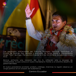 El senador y exalcalde de Tarija obtuvo el 54,5 % de los votos en la segunda vuelta, derrotando al expresidente Jorge “Tuto” Quiroga. Asumirá la presidencia el 8 de noviembre, con la promesa de reconciliación y reformas económicas profundas.