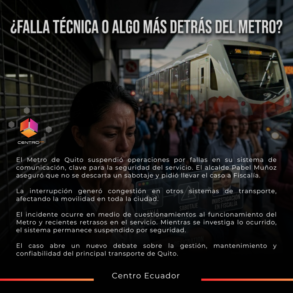La mañana del 20 de abril de 2026, el Metro de Quito suspendió completamente sus operaciones tras detectarse fallas en su sistema de comunicación, considerado clave para garantizar la seguridad del servicio.