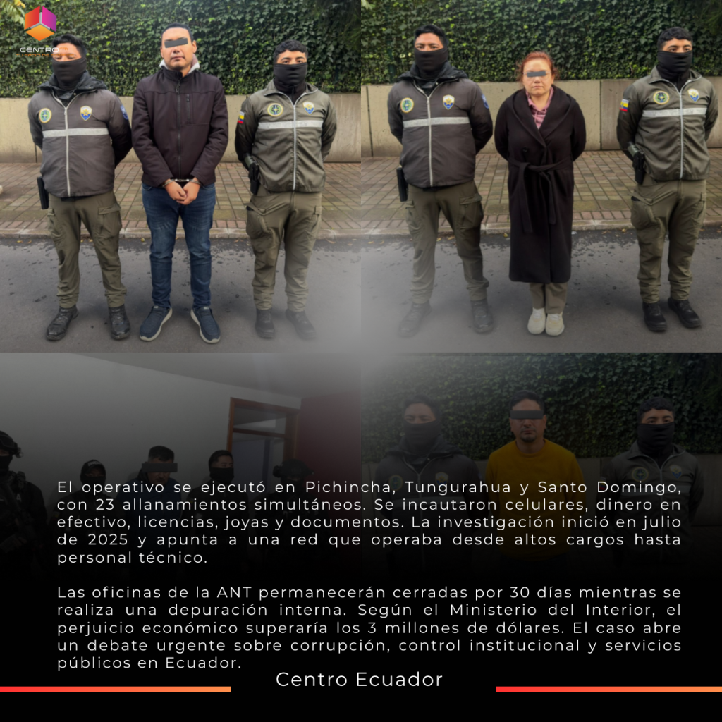 Fiscalía detuvo al director nacional y a varios funcionarios por presuntos cobros ilegales para agilizar trámites. Se ejecutaron 23 allanamientos y las oficinas de la ANT permanecerán cerradas por 30 días. Un nuevo golpe contra la corrupción en Ecuador.