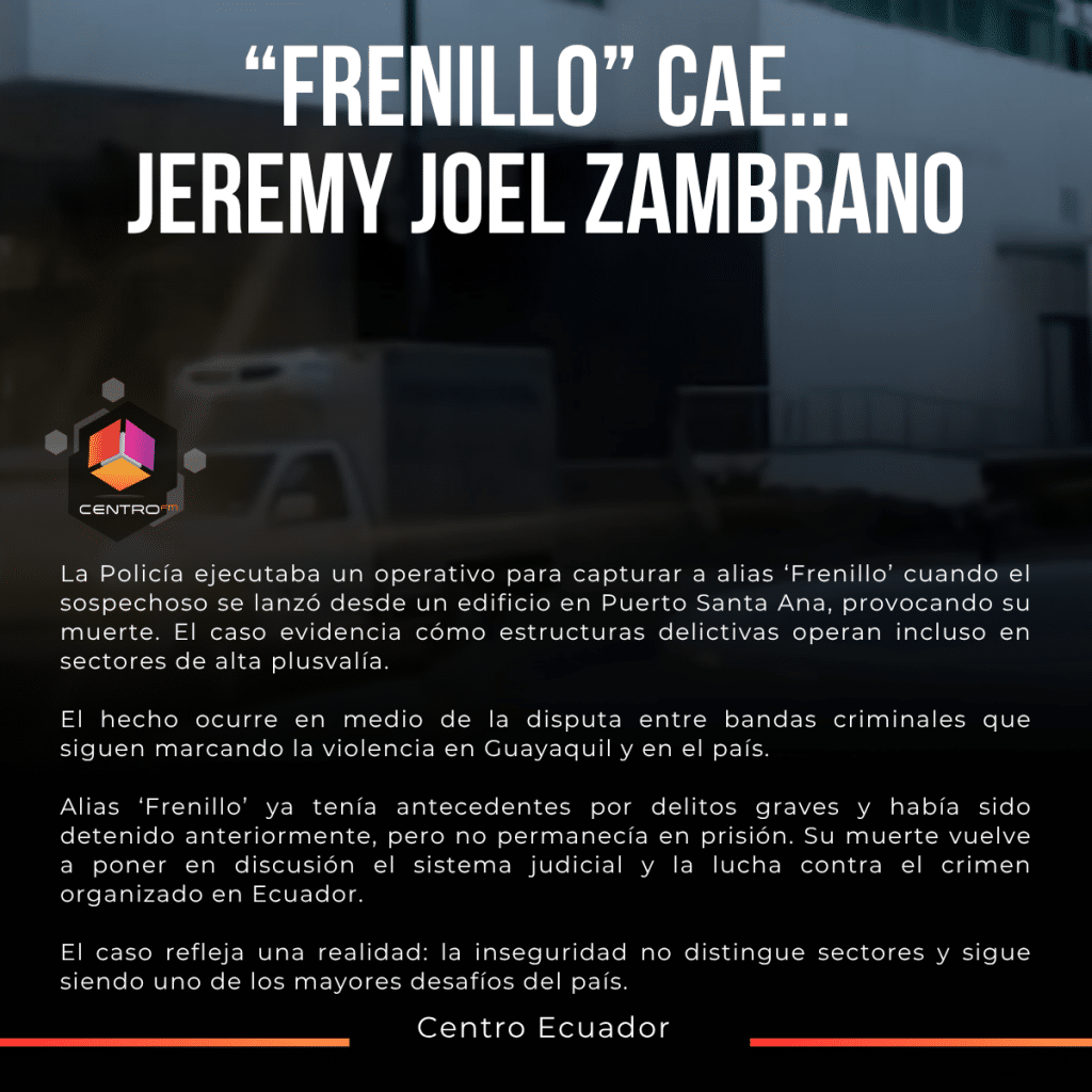 La madrugada del 16 de abril de 2026, un operativo policial en el sector de Puerto Santa Ana, en Guayaquil, terminó con la muerte de Jeremy Zambrano, conocido como alias ‘Frenillo’. El sujeto, identificado como presunto cabecilla del grupo criminal Mafia 18, cayó desde un edificio al intentar evadir su captura.
