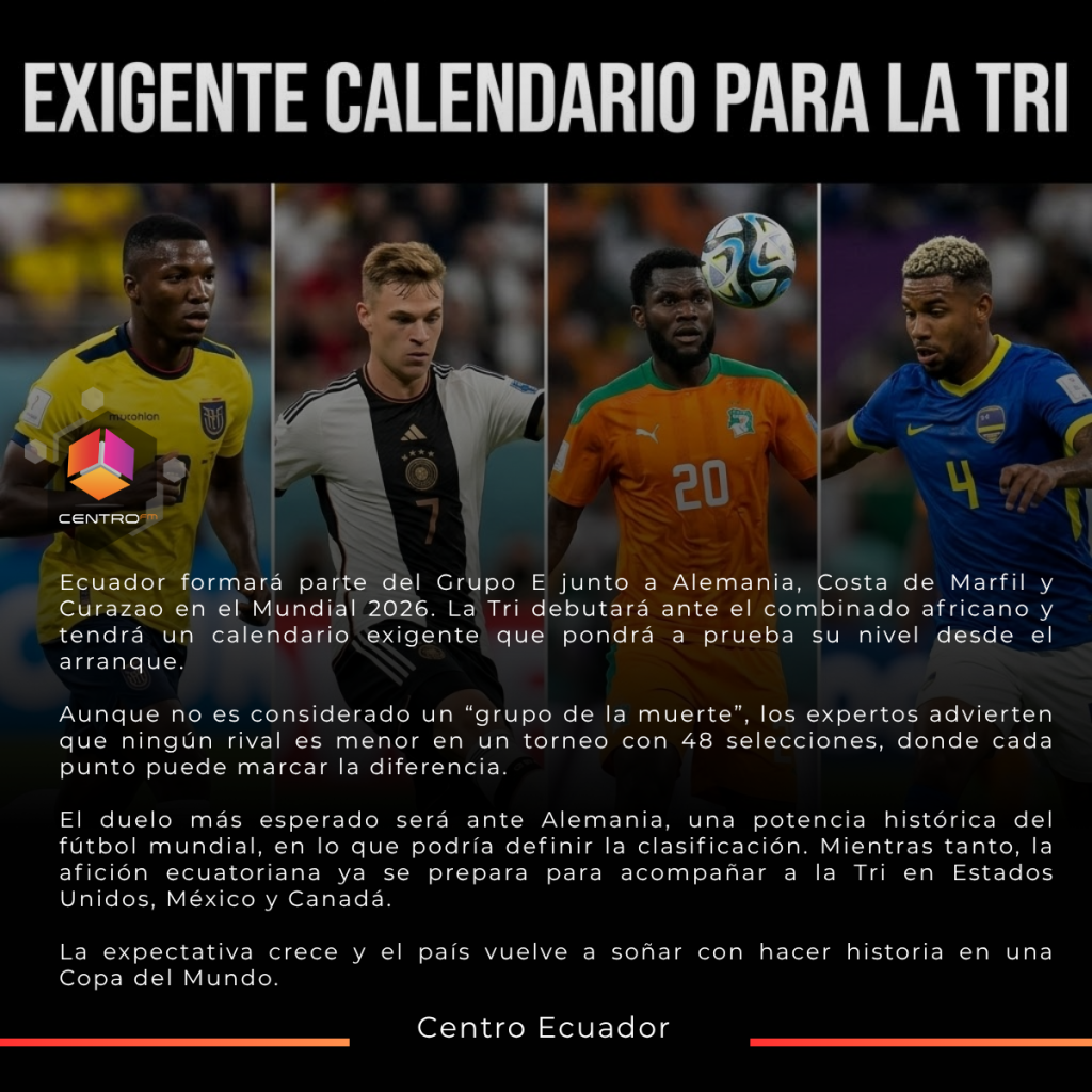 Ecuador ya conoce a sus rivales en el Mundial 2026: Alemania, Costa de Marfil y Curazao. La Tri enfrentará un grupo equilibrado que exigirá su mejor nivel para avanzar en el torneo más competitivo de la historia.