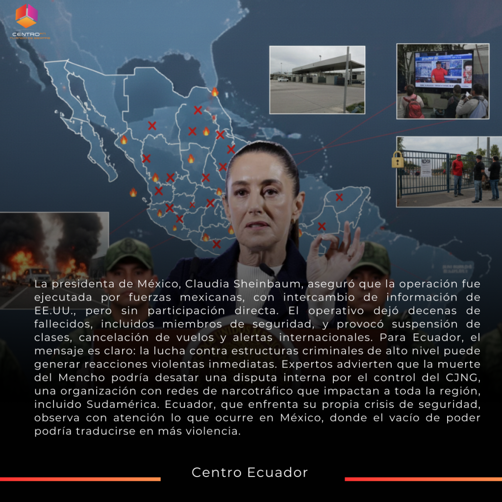 El impacto no es exclusivo de México. Ecuador, que enfrenta su propia crisis de seguridad vinculada al crimen organizado y al narcotráfico, observa con atención el escenario. La fragmentación de grandes estructuras criminales suele provocar reacomodos violentos y expansión de operaciones hacia otros territorios.