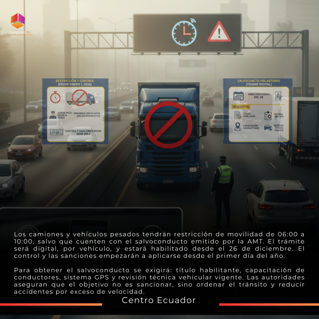 Desde el 1 de enero de 2026, los vehículos pesados deberán contar con salvoconducto para circular por la Simón Bolívar y Ruta Viva entre las 06:00 y las 10:00. La medida, aplicada por el Municipio de Quito, busca reducir accidentes y reforzar la seguridad vial. El trámite se realizará a través de la AMT y será obligatorio para todo transporte de carga.